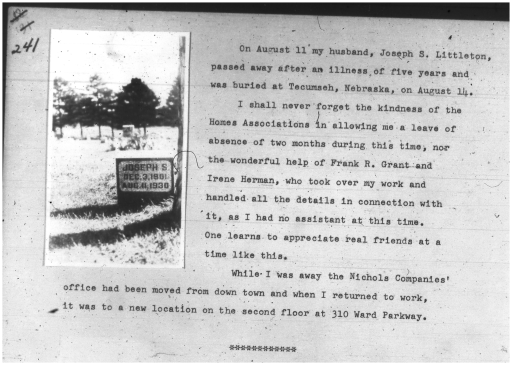 When they returned in the summer of 1926, the Nichols Company took her back, as a relief worker, filling in where needed. In the fall, she took on the role of secretary for the newly formed Country Club District Homes Association, which paid $150 a month and offered a position of high visibility and responsibility within the company. Faye’s career was improving, but unfortunately the same could not be said of her husband’s health. In 1930, Joseph Littleton died from tuberculosis. He was only 29. The couple had no children, and Faye never married again.
