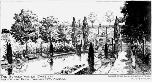 In April 1911, Kansas City, Kansas unveiled its city-wide Parks and Boulevard Plan, credited as the work of George Kessler, the architect of KCMO’s 1893 plan. But it was principally the work of Hare & Hare, the landscape architecture firm at the time gaining a national reputation from its work for the Nichols Company’s Country Club District development. Waterway Park was among the parks included in the KCK Plan, so-named for the series of ponds and lakes which were to define the park in every way.