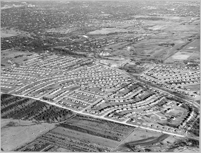 Aerial view of the Prairie village Shopping Center and the adjacent neighborhoods, late 1940s. Photo courtesy the State Historical Society of Missouri.