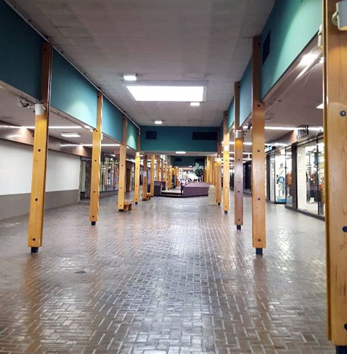 In 1978, the Nichols Company took another stab at reinvigorating the mall with a stylistic overhaul prompted both by aesthetics and market. In the press release, then-company president David Jackson explained, “Through major reconstruction of the physical environment and a modified and enlarged merchandise mix, The Landing will have a particular appeal to today’s style-conscious shopper.” The design firm called their theme “today” and promised the mall would be contemporary and “almost like walking through a piece of sculpture…very architectural, but very human in scale.” Yet the design described is dizzying. Multi-colored canvas-covered aluminum frames hanging from a lowered ceiling. A patchwork of flooring – parquet, ceramic tile and carpeting. Wooden beamed ceilings and wood-clad support columns. Skylights covered to “control ambient lighting.. From pictures, the place looks dim, cold and empty.
