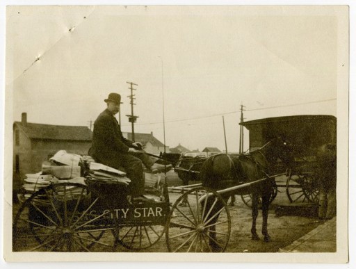 Photos: (top banner) an example of a printing press of the era (there being no available picture of the Kansas City Star’s press at that time) comes from Reading, PA, circa 1900; remaining photos in sequence depict the street-level distribution system of the Kansas City Star of that same “circa 1900” era from top to bottom: (top) paper boys sort and count the daily papers delivered to the Olathe, Kansas Star offices, 1922; (second) Papers ready for delivery by the Olathe paper boys, circa 1922; (third) In 1910 in Pittsburg, Kansas, newspaper delivery was by horse drawn wagon; (bottom) By 1925 , a news agency in Pittsburg, Kansas was delivering the Kansas City Star by truck.